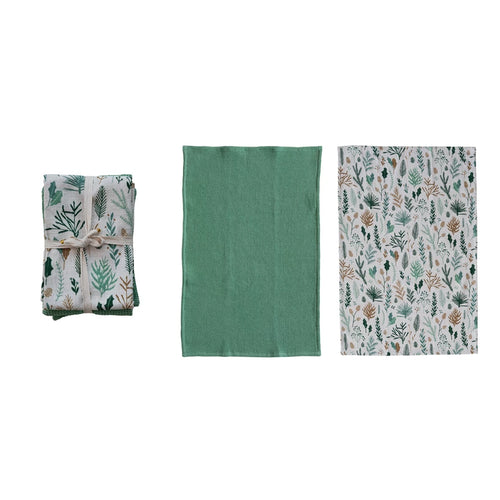 Woven Waffle Weave/Slub Tea Towel with Winter Botanicals Pattern (Set of 2)