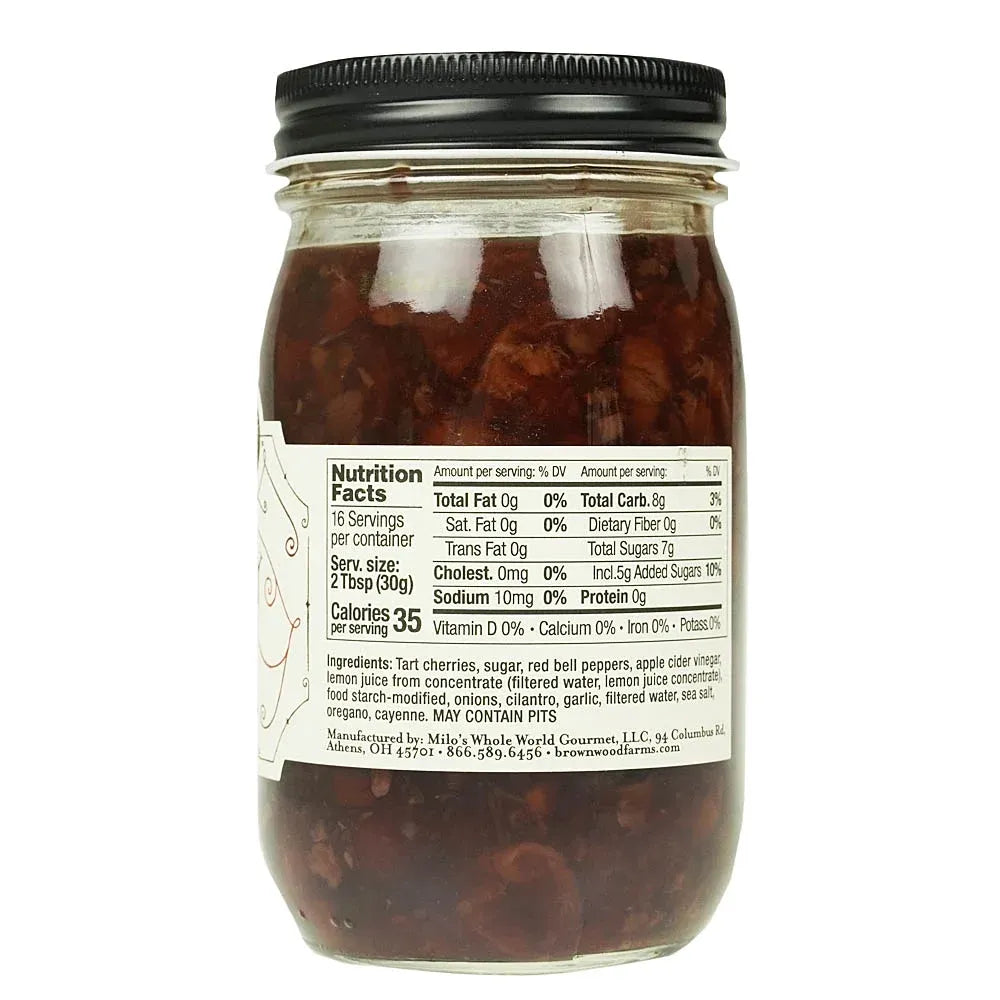 - Ingredients: tart cherries, sugar, red bell peppers, filtered water, cider vinegar, modified food starch, onions, garlic, cilantro, lemon juice concentrate, sea salt, oregano, cayenne