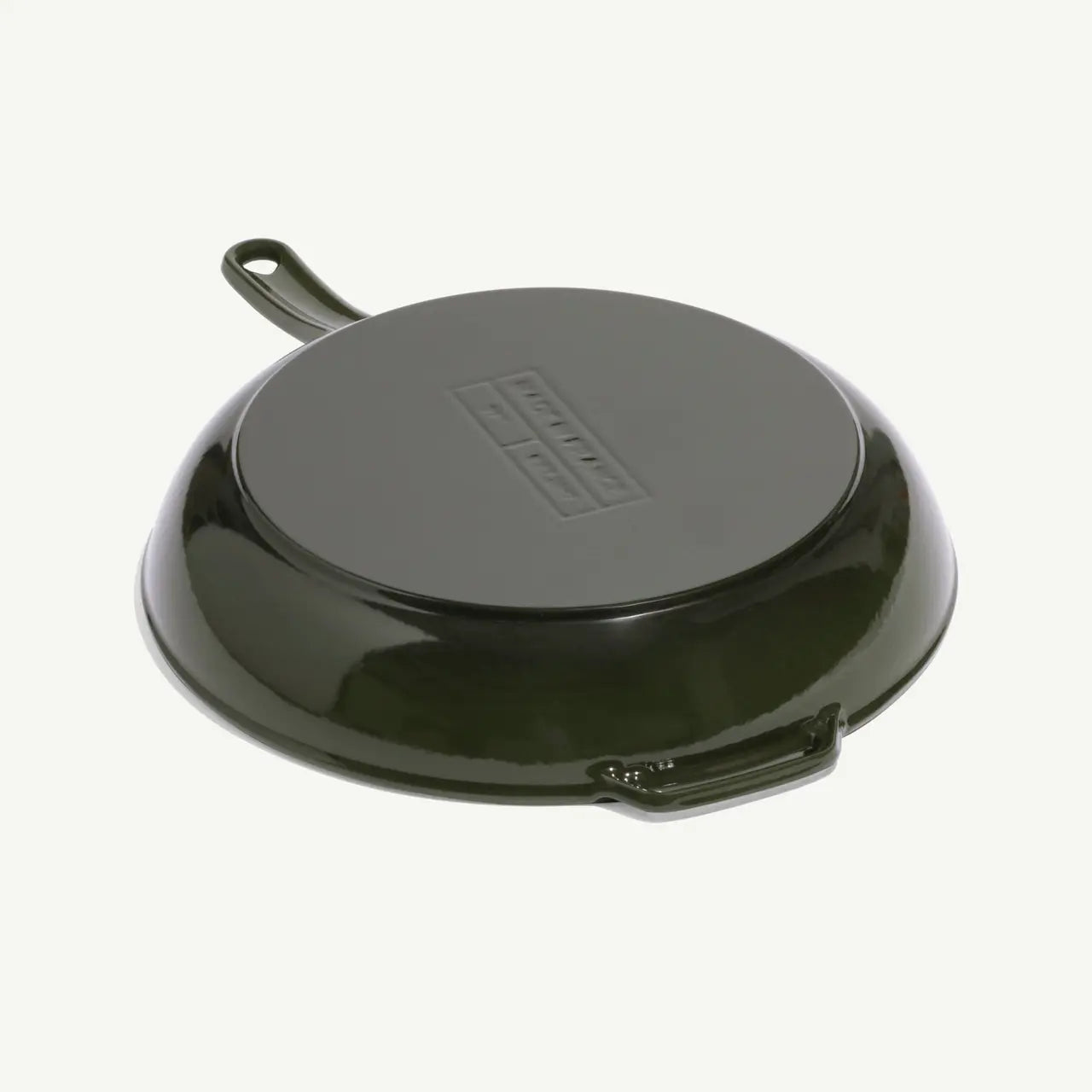 This piece combines the romanticism and versatility of a southern-style cast iron Skillet with the easy-to-care-for enameled surface that made the Dutch Oven famous. This means you can create a golden-brown sear on large cuts of meat and simmer smaller batches of sauce without having to worry about maintaining a seasoning. Plus, you can oven roast up to 580F—80 degrees higher than other French-made brands. Each Skillet features a dark surface that’s optimized for high-heat frying, grilling and searing.