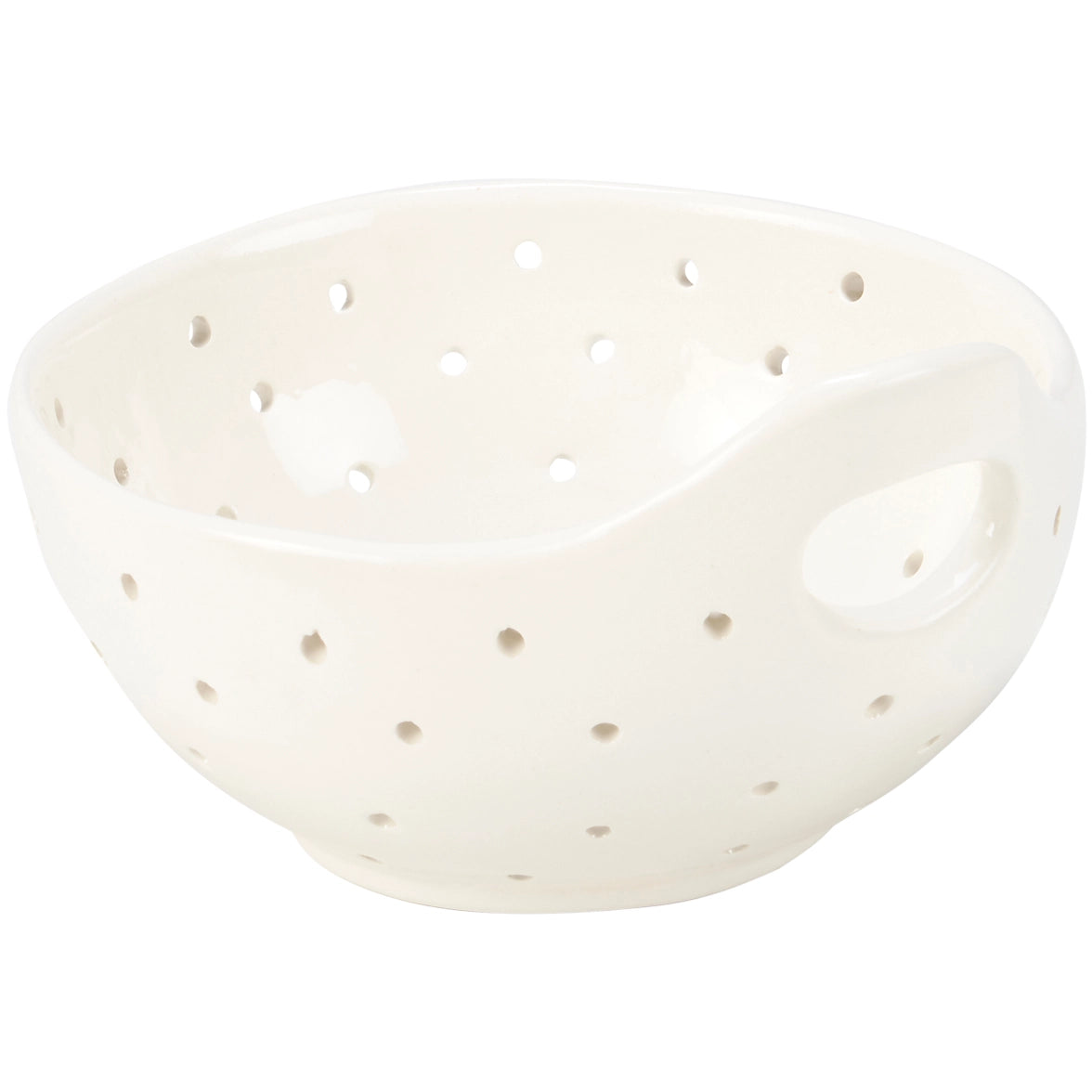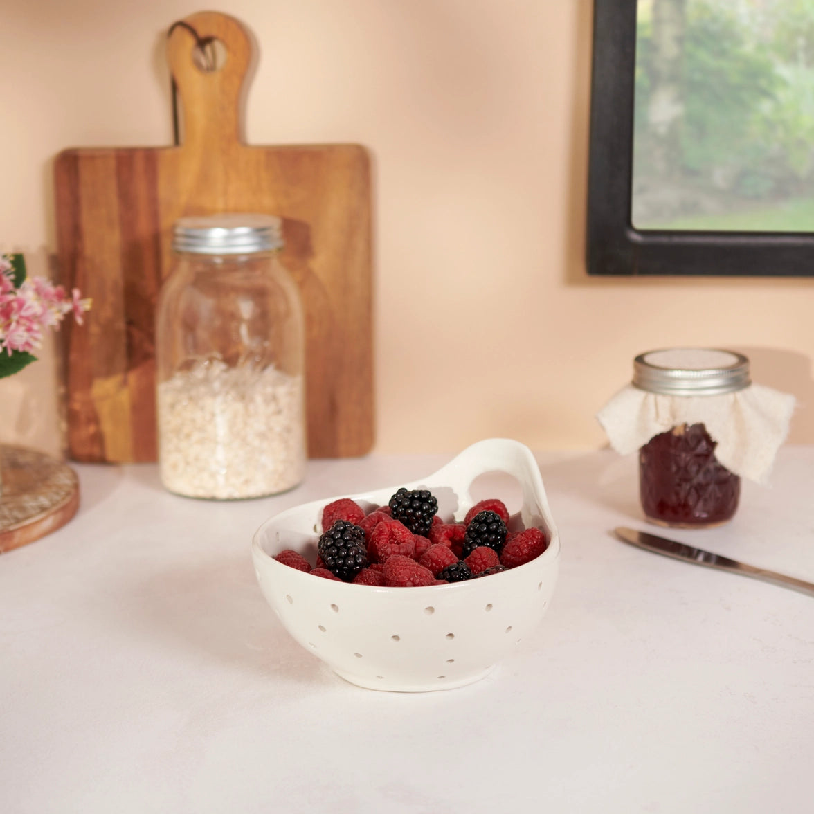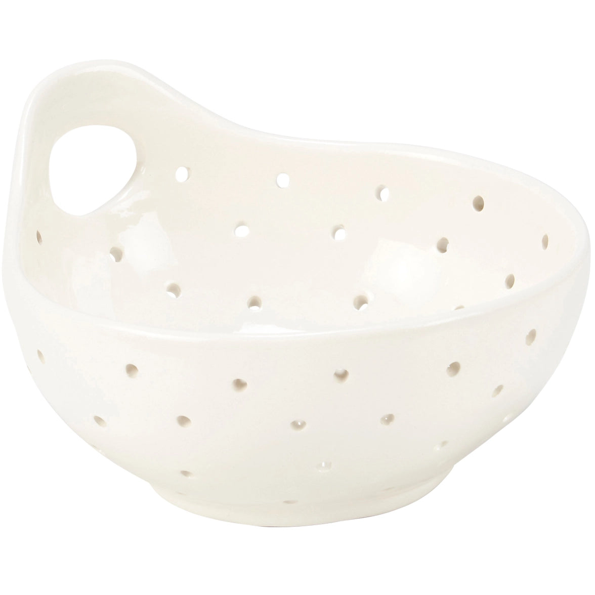 This stoneware berry bowl is ideal for washing and holding fruit. The berry bowl features a handle for easy carrying and accent holes throughout. It can be used to serve food or for decorative accents. Hand wash only. This Farmhouse berry bowl is a piece of rustic tableware perfect for everyday use.