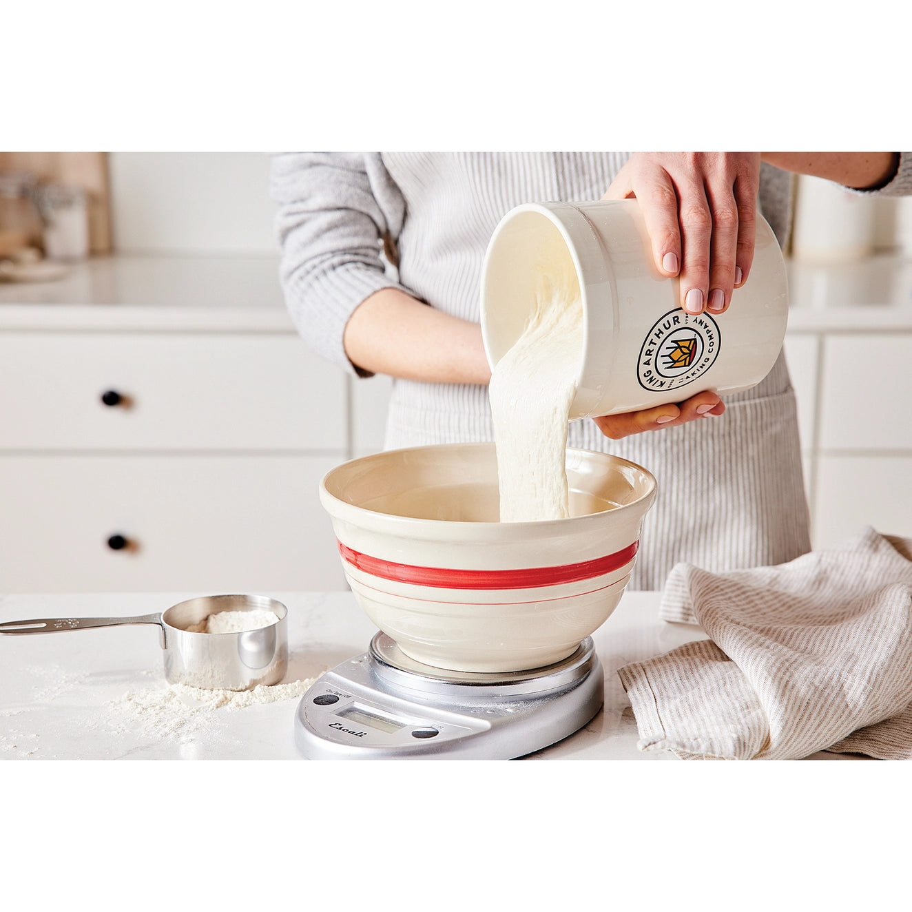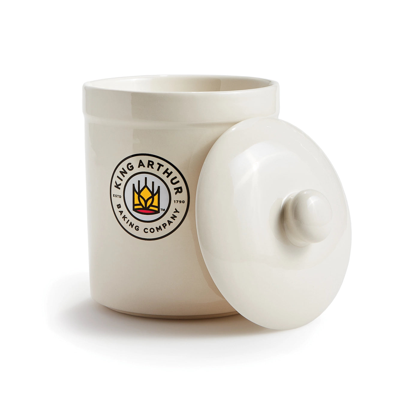 The King Arthur Baking Company Classic Sourdough Starter Storage Crock stores sourdough starter to keep it fresh and active on the counter or in the refrigerator. Its durable construction is made from ceramic with non-reactive glaze, heat safe (up to 480-degrees Fahrenheit), measures 5.33 x 5.33 x 7.5-inches, 1-quart capacity. With a roomy and versatile design, the 1-quart usable capacity allows for easy mixing and stores enough starter for several loaves of bread.