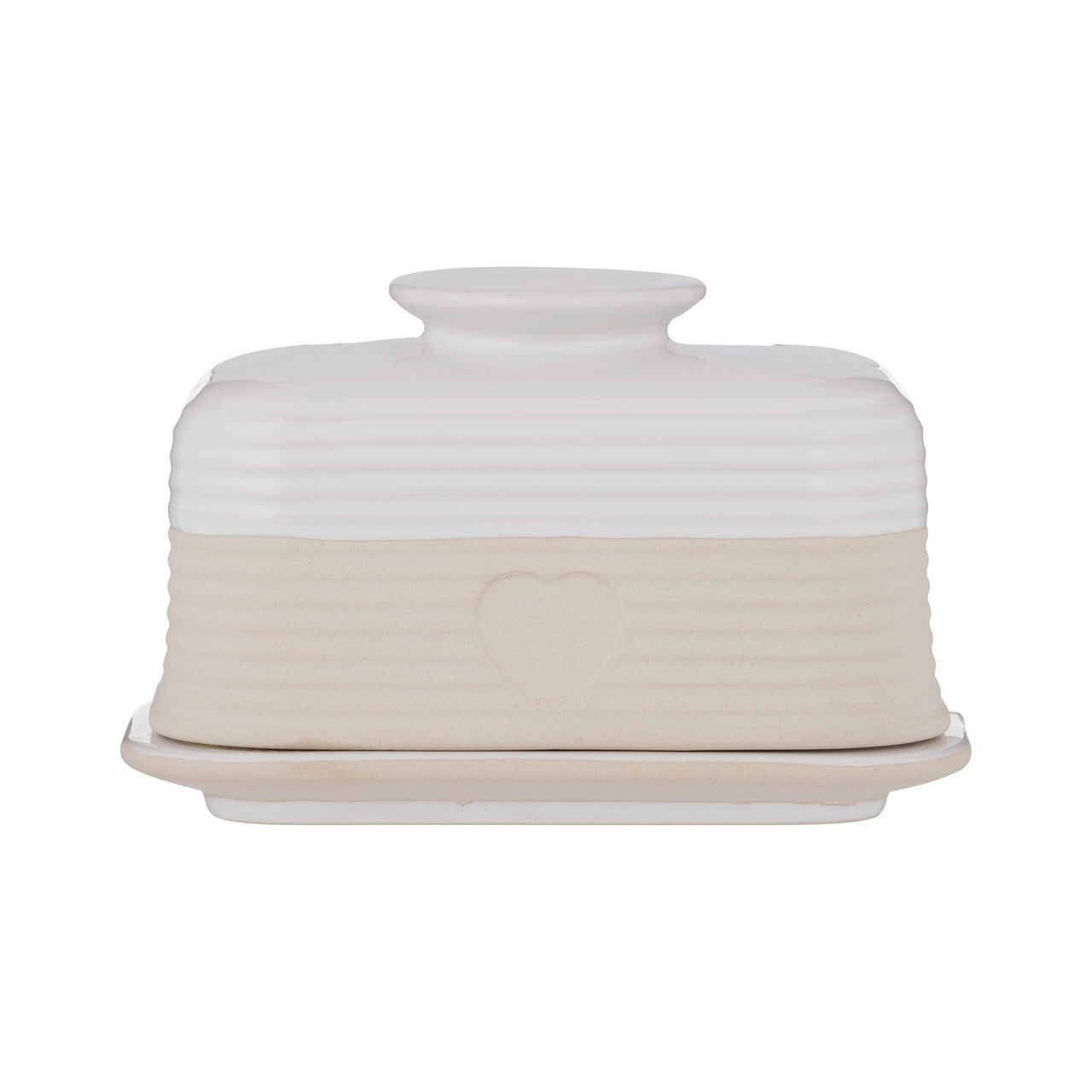 The durable, thick base is designed with parallel ridges ensuring the block of butter stays securely in place. The elegant, embossed lid will keep the contents fresher for longer. Fits up to 500g of butter and measures H10cm x W15.6cm x D10.6cm. Made from Stoneware, the butter dish is dishwasher safe.