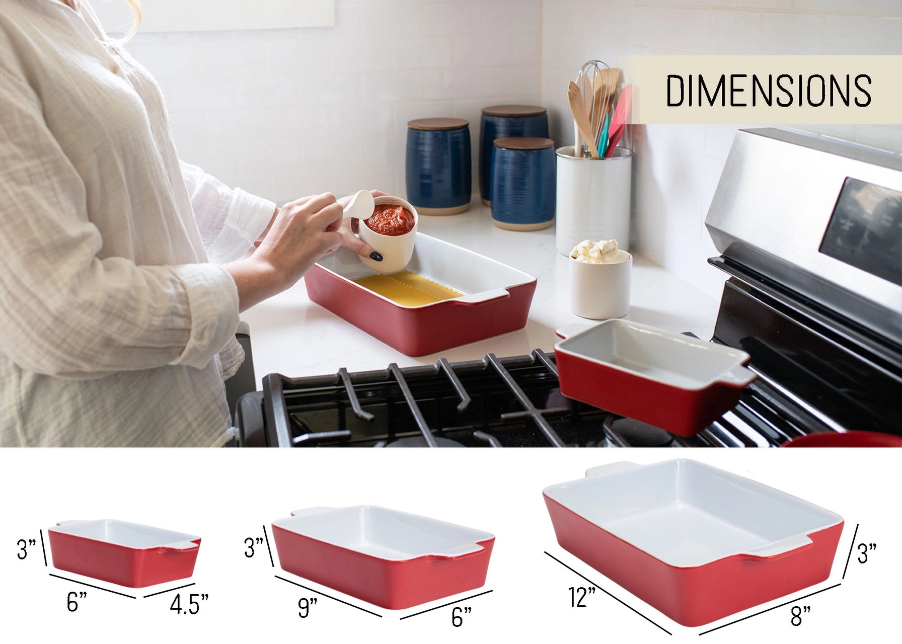 These versatile red ceramic stoneware baking dishes come in three convenient sizes—12 x 8, 9 x 6, and 6 x 4.5 inches—making them perfect for everything from lasagna and roasted vegetables to sheet cakes. Each pan features sturdy side handles for safe carrying and a beautiful finish that complements any kitchen. Microwave and dishwasher safe for effortless cleanup, and oven safe to 450 degrees. Whether you're setting up a new home or looking for a thoughtful gift, these functional and attractive dishes are ready to become kitchen staples.