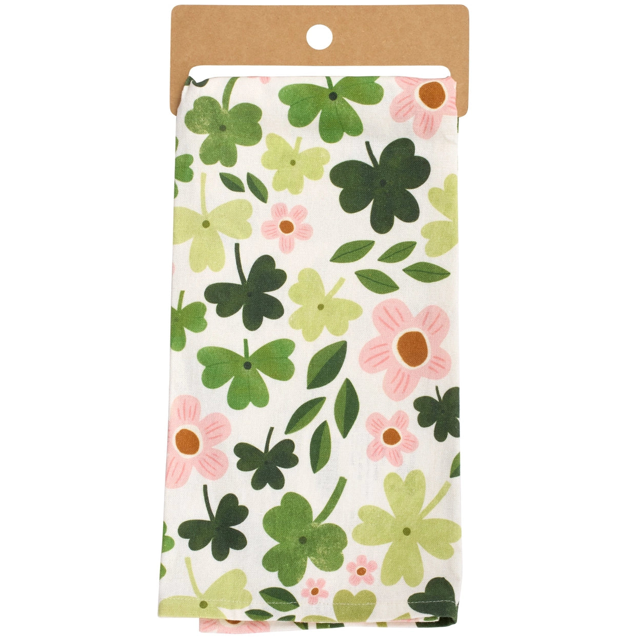 This cotton kitchen towel features an all-over design displaying a toss pattern of shamrocks and spring flowers replicated from original hand illustrated artwork. This St. Patrick's Day themed towel features a coordinating pink pom trim for added interest. The Shamrocks kitchen towel is conveniently machine-washable for easy cleaning. A stylish shamrock-themed kitchen accessory perfect for seasonal use.
